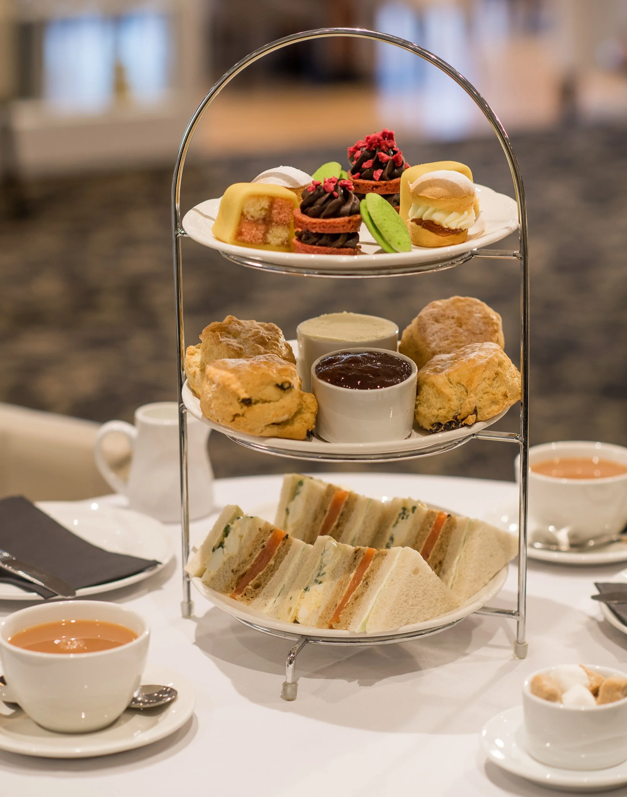 Selection of Sandwiches & Wraps, Haggis Bon Bon’s, Homemade Warm & Plain Scones served with jam and clotted cream, French Macarons, Chocolate Brownie, Carrot Cake, Mini Fresh Strawberry Tarts, Tea & Coffee.